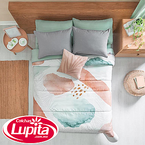 Dale un toque artístico a tu espacio y transforma tu habitación en un refugio lleno de dulzura y elegancia con nuestro Edredón Bahía, sus colores menta y rosa te encantarán.
