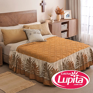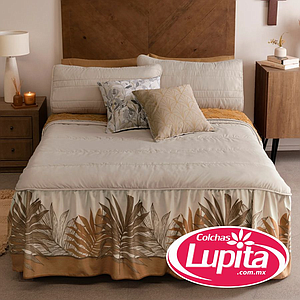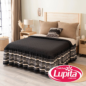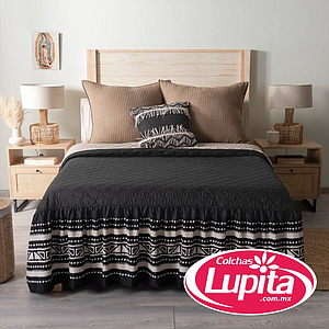 Da un toque de elegancia y vanguardia con el tono negro en combinación con el greige, amarás su contraste y el estampado bohemio en el holán. Colcha con holán estampado y capitonado especial, suave por su textura viasoft. Complementa con fundas y cojines.