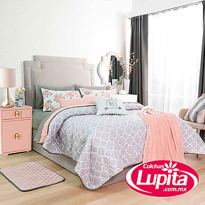 Un edredón boho-chic que te hará sentir fresca y llena de tranquilidad todo el año. La combinación del gris, azul, rosa y acentos en blanco, capturan la esencia juvenil con el que podrás darle el toque moderno que necesita tu habitación. Juego de edredón doble vista. Ligero.