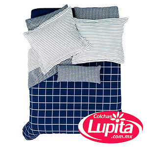 Original composición con diferentes estampados. En el edredón Chicago se juega con la combinación de cuadros y líneas, todo en color azul marino y blanco, dará a tu recámara una apariencia moderna. Juego de edredón MAT vista.